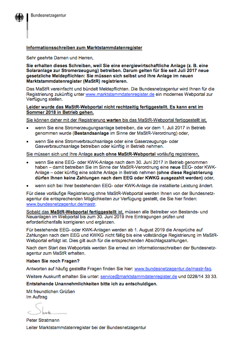 Das Schreiben, das die Netzbetreiber den Anlagenbetreibern bei der Jahresendabrechnung für das Jahr 2017 beifügen müssen, finden Sie auf den Seiten der Bundesnetzagentur unter diesem Link.